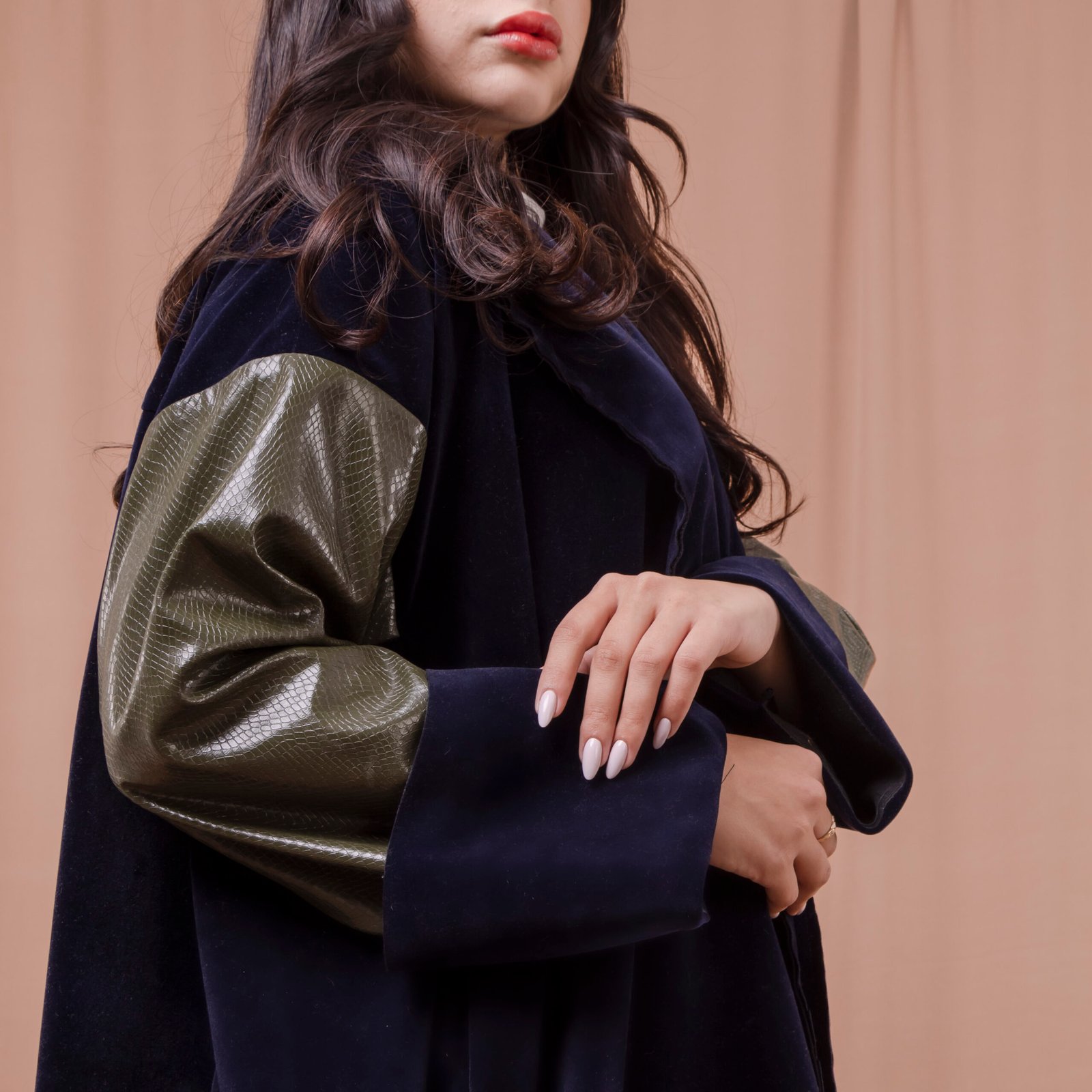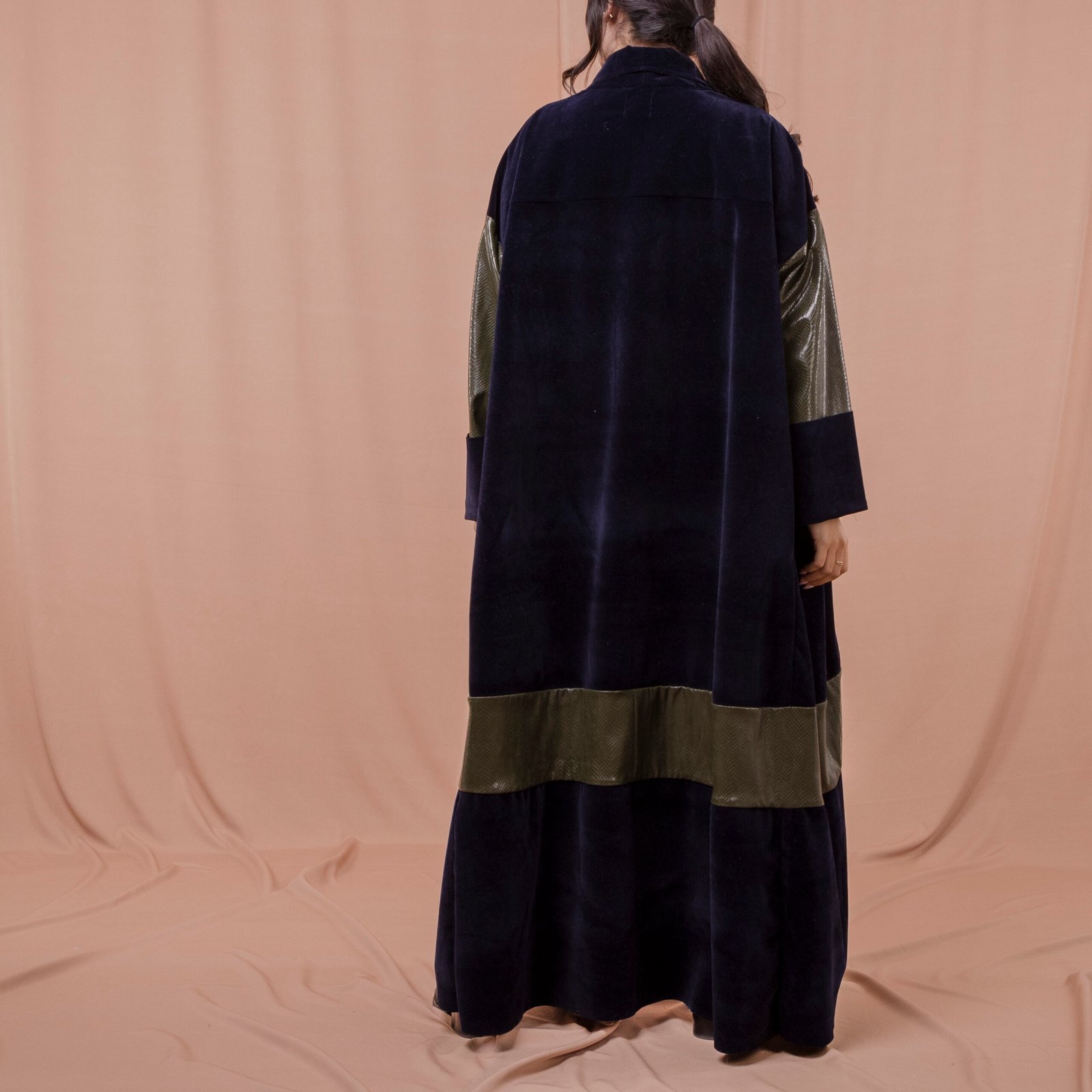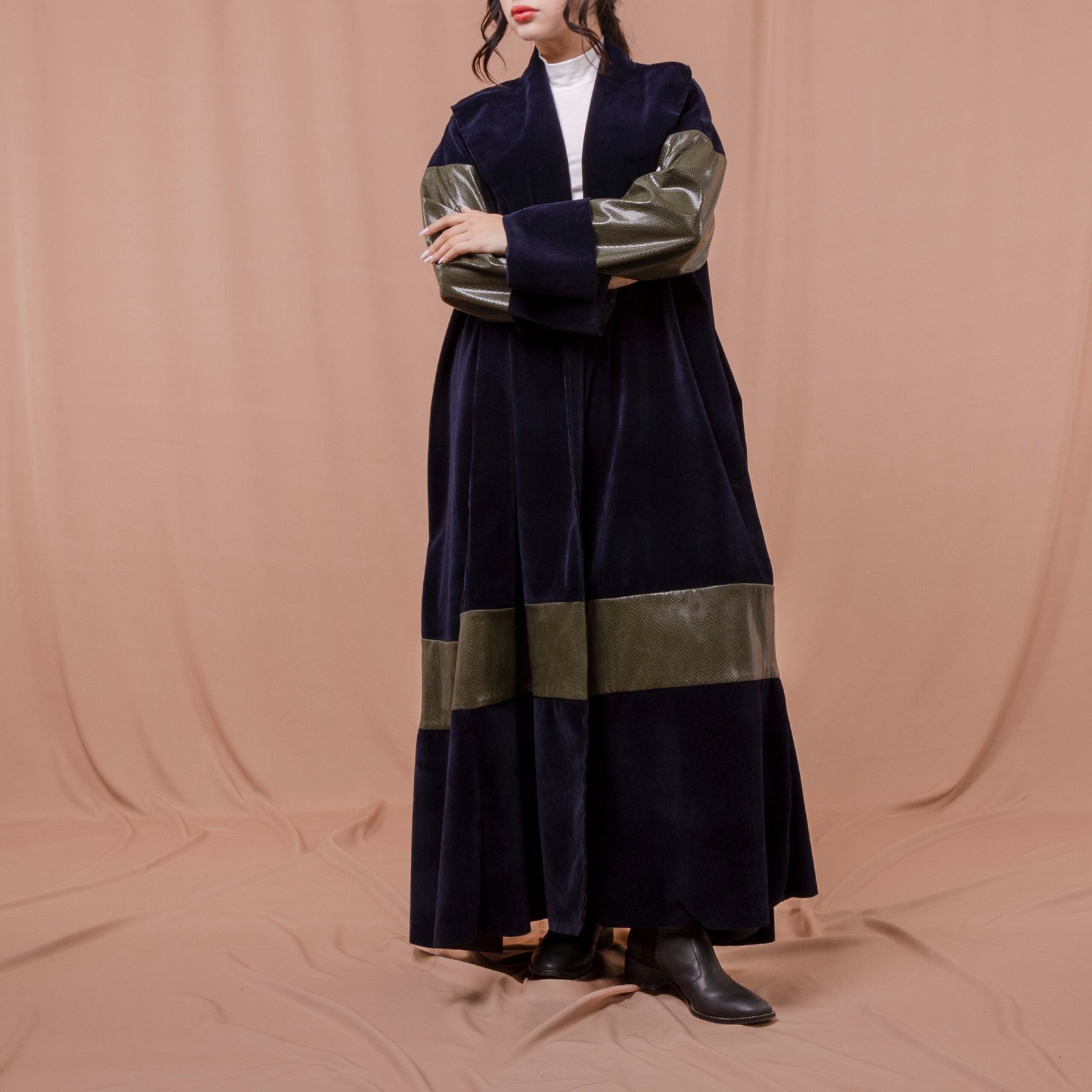 Fabric: Long olive green leather sleeves with navy velvet suede (chamois) fabric