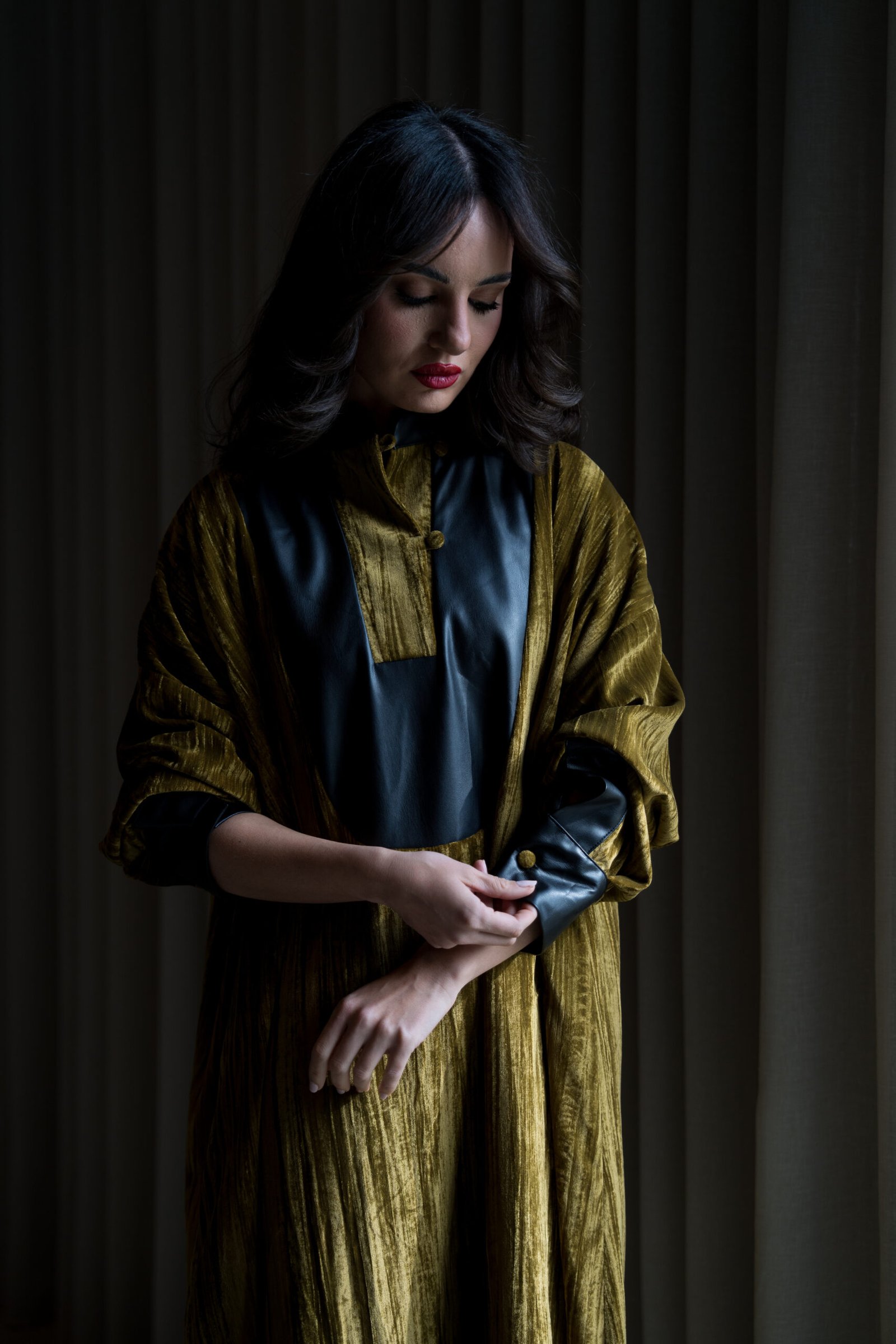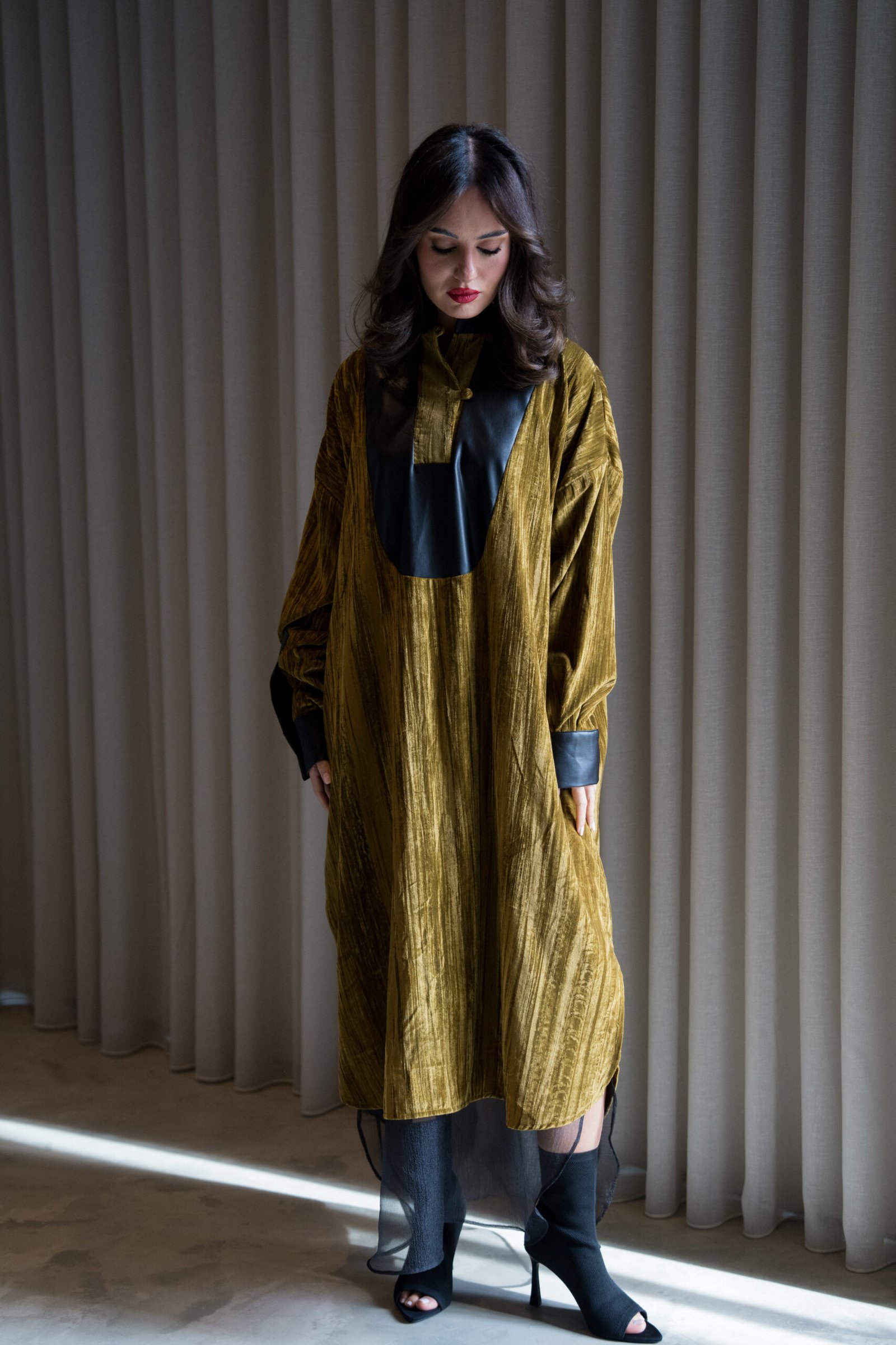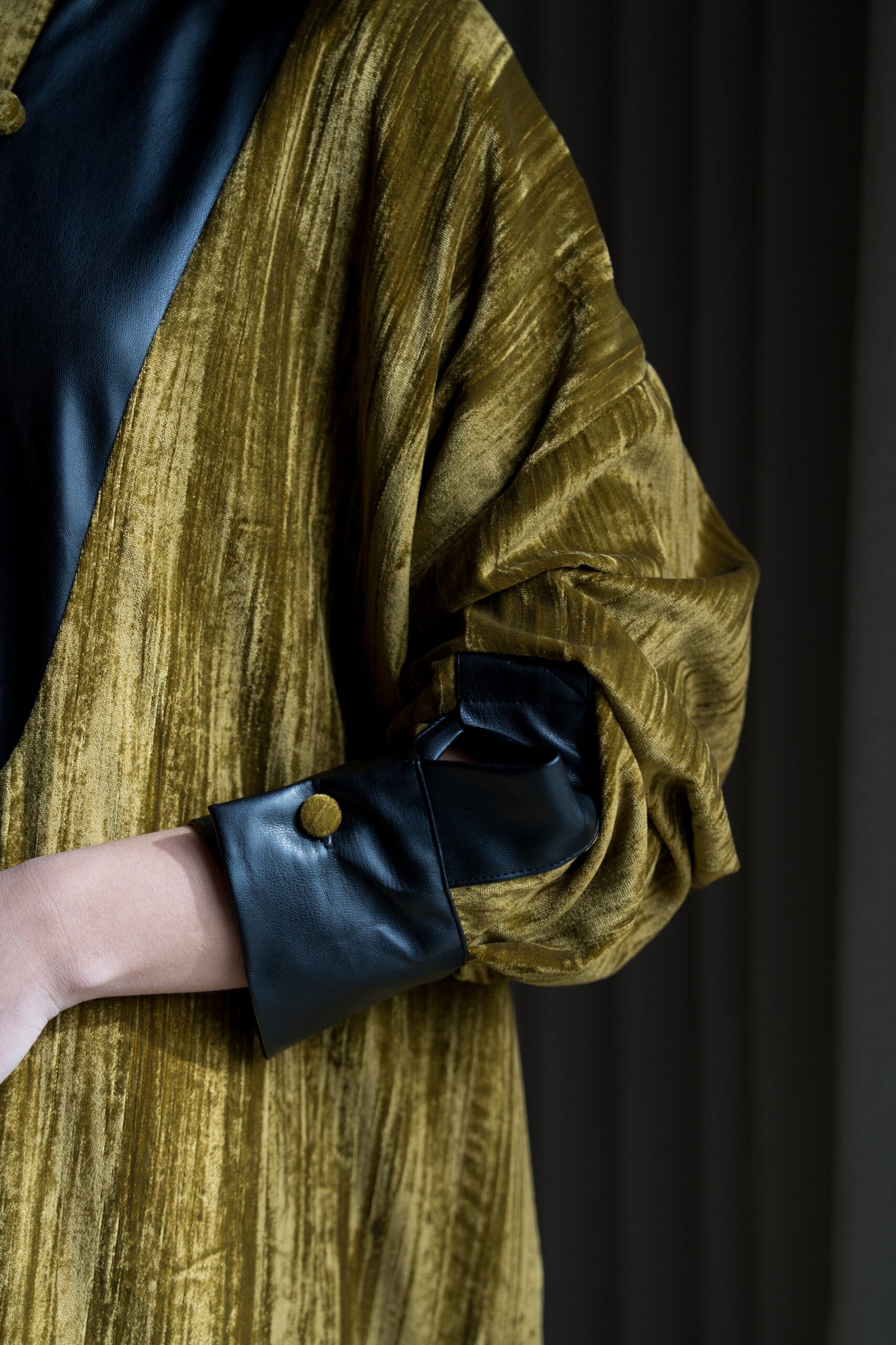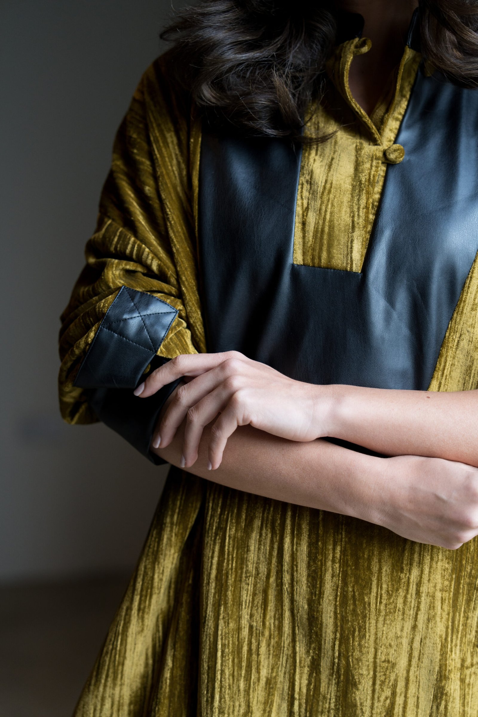 Velvet kaftan featuring premium black leather accents on the chest and sleeves