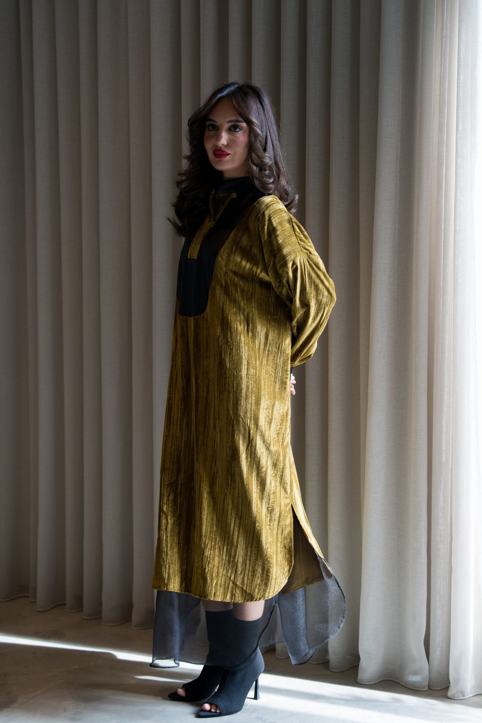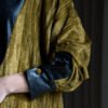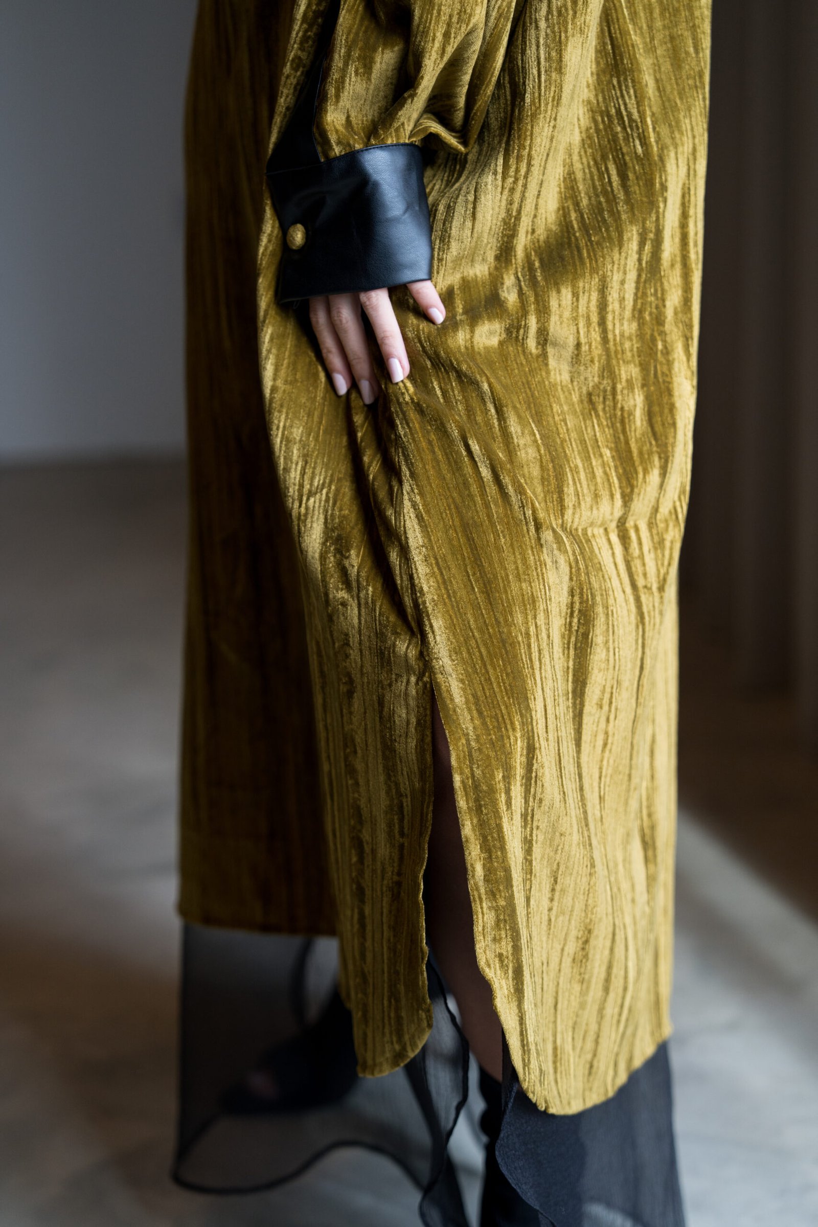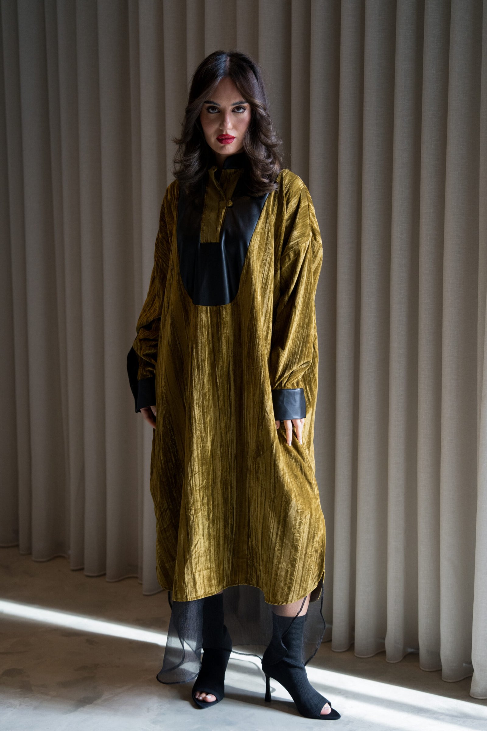 Velvet kaftan featuring premium black leather accents on the chest and sleeves