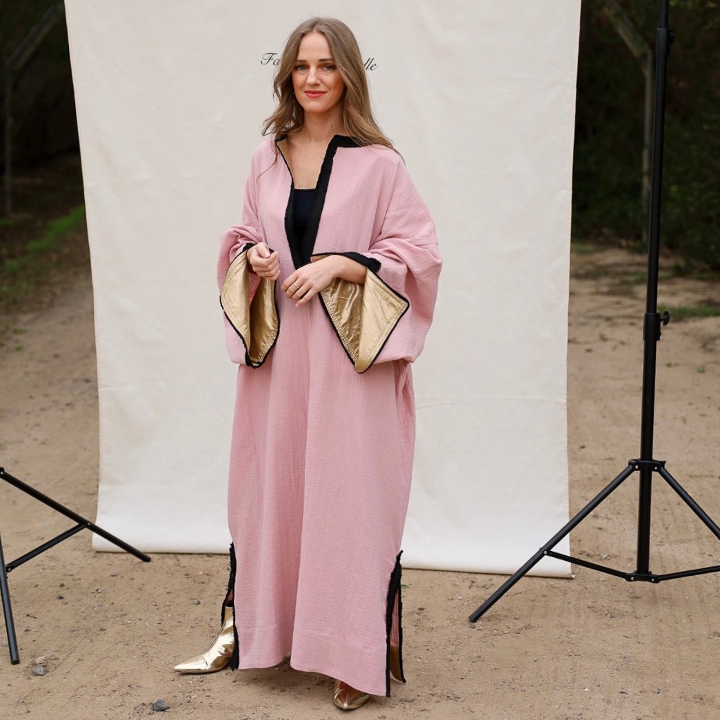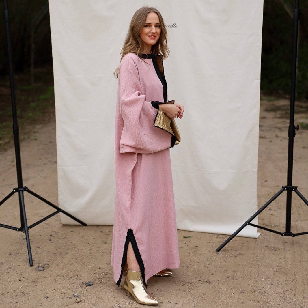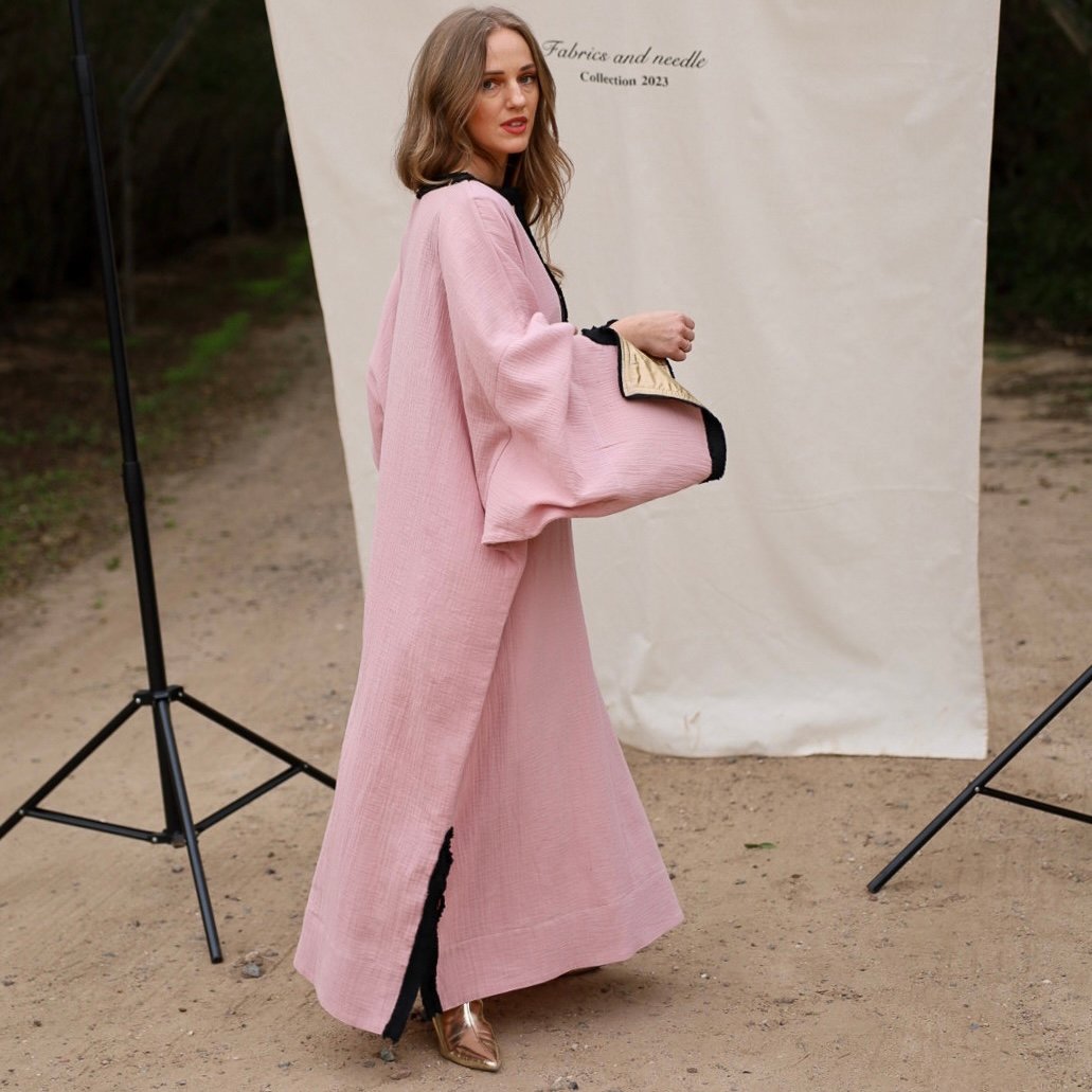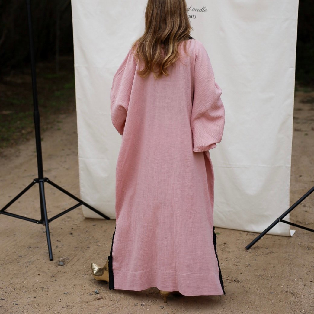 Tha kaftan is mad3e of cotton and is outlined with high contrast black piping
